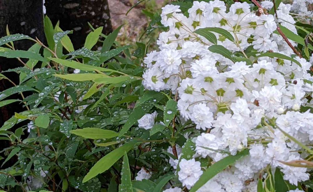 豪華な八重咲き小手鞠も今日は雨にしなだれて…。🤍