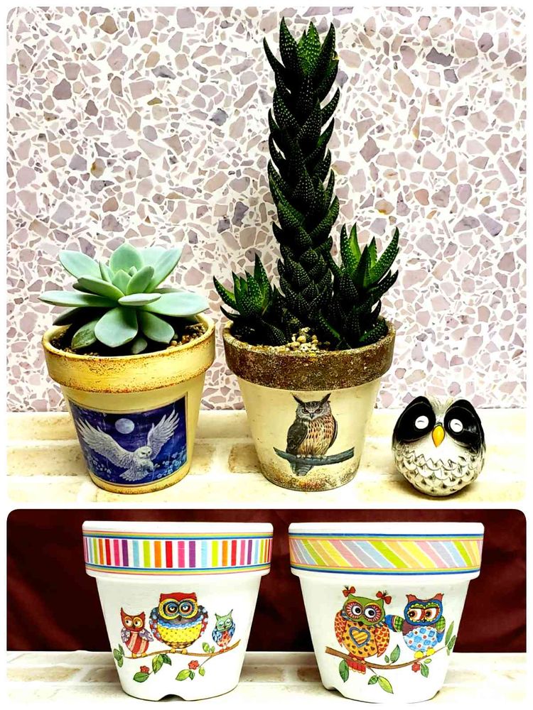 カラフルで可愛いフクロウさんのリメ鉢ができました。😄🎶