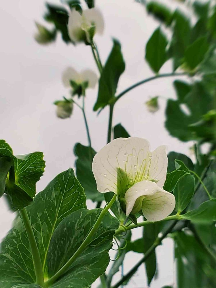 散歩途中の畑に楚々として咲いている絹さやの花、雨にぬれてしっとり .....