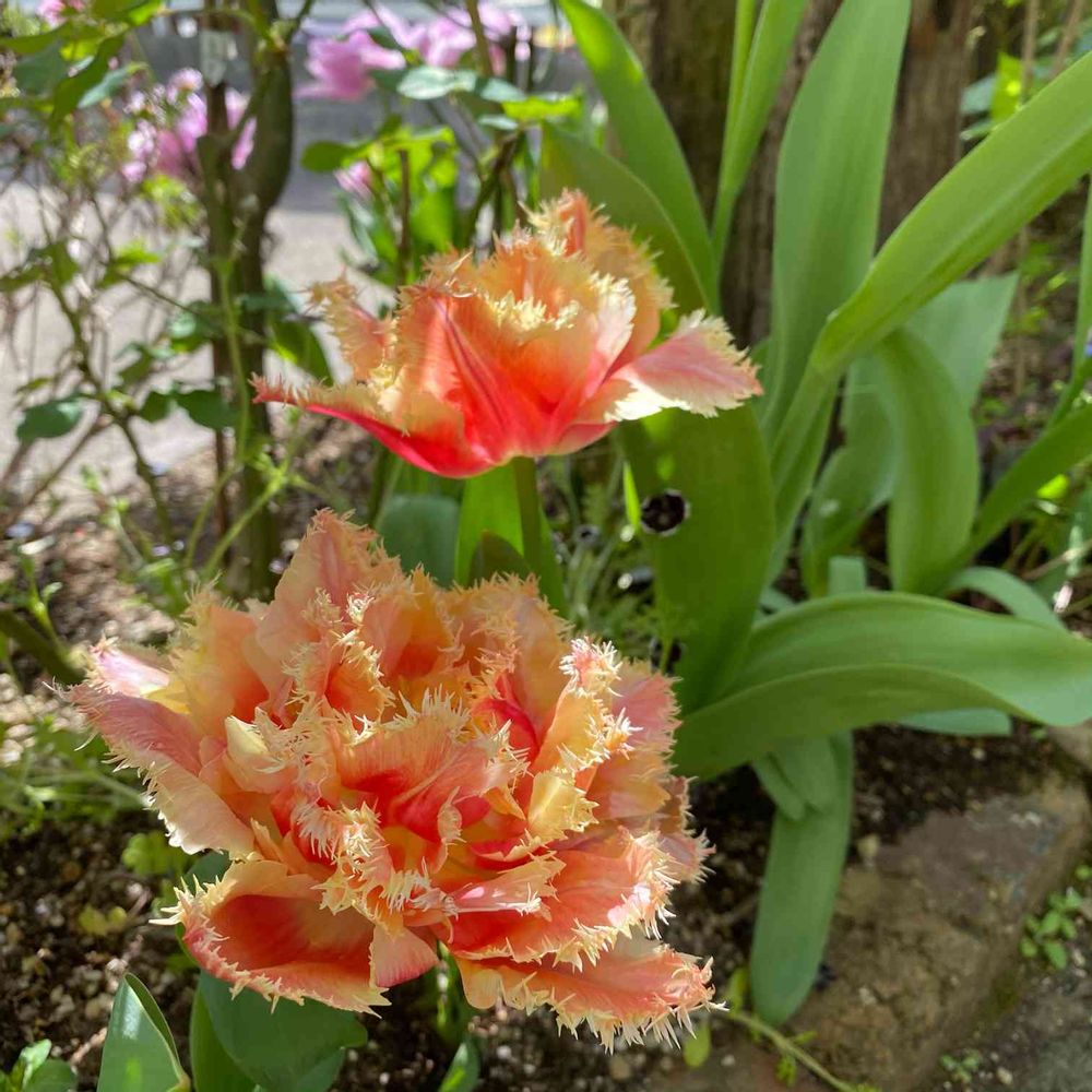 段々とオレンジ色が濃くなっていくチューリップ。フリフリの花弁も可愛いでしょ。🧡🧡🧡