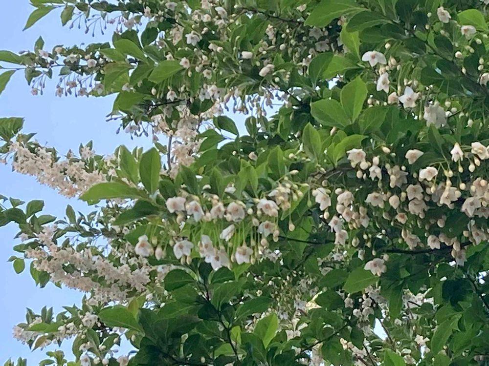 見上げたら 小さなエゴノキの可愛いお花が たくさんぶら下がって咲いていました♫