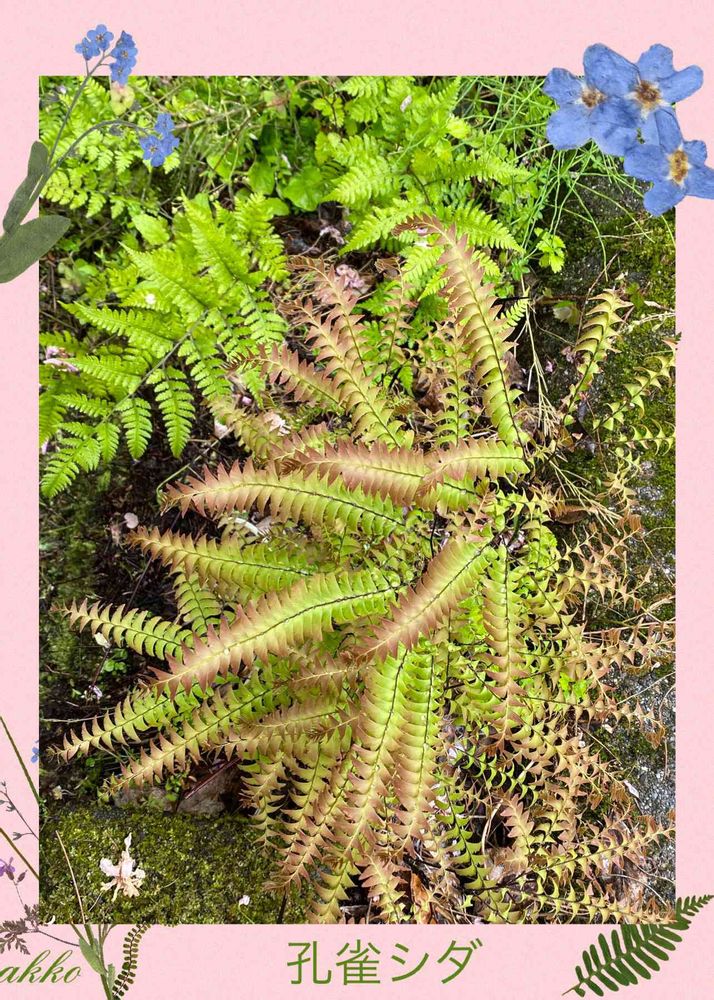孔雀シダが普通のシダのそばで、芽出しが美しい葉です