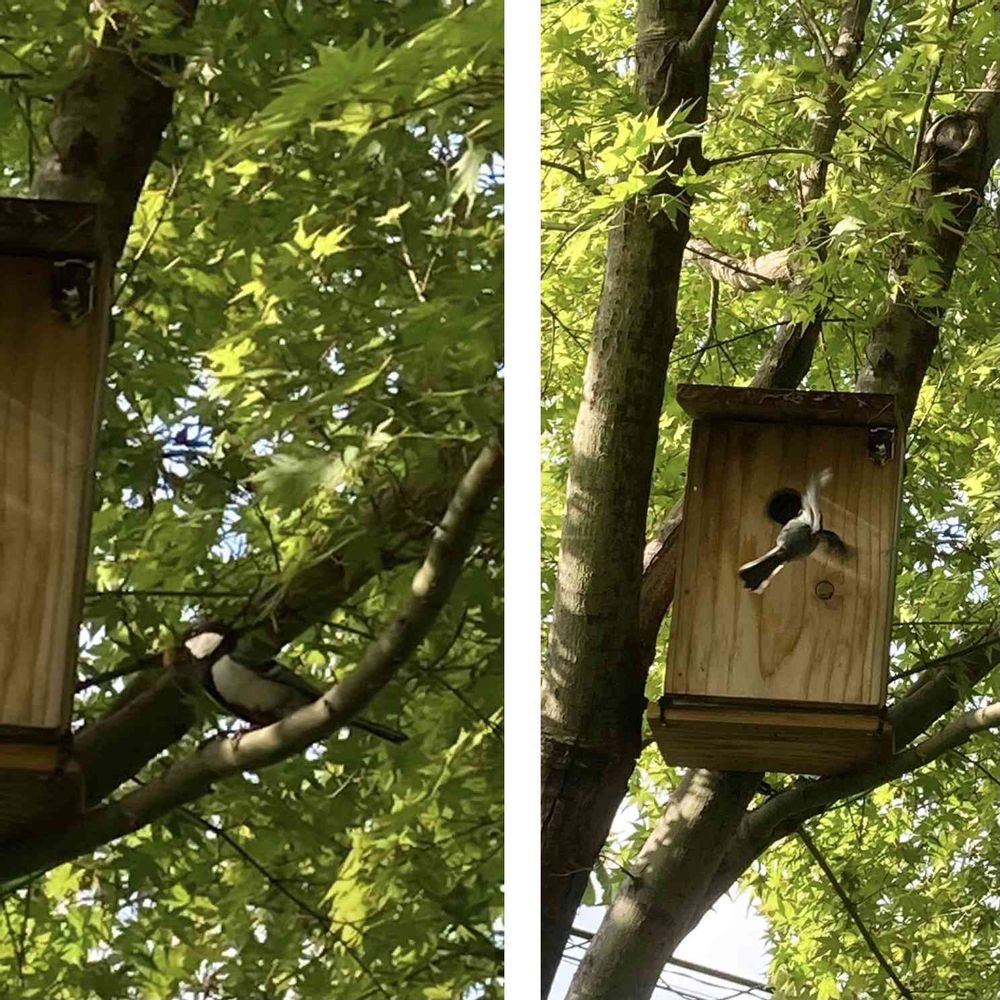 庭のモミジの木に主人が作った鳥の巣箱を設置してあります。そこに小鳥さんが住み着いて、雛の声も聞こえます。巣箱に入ってくれたのは今年初めてで嬉しい!