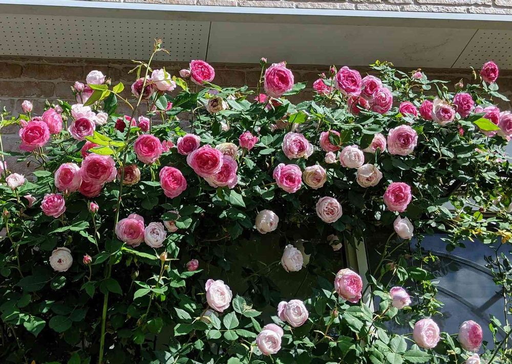 マダムピエールオジェがアーチの上の方で満開です🤗来年はもっと下の方に誘引しないと♪庭に出ると香りが漂っています✨
