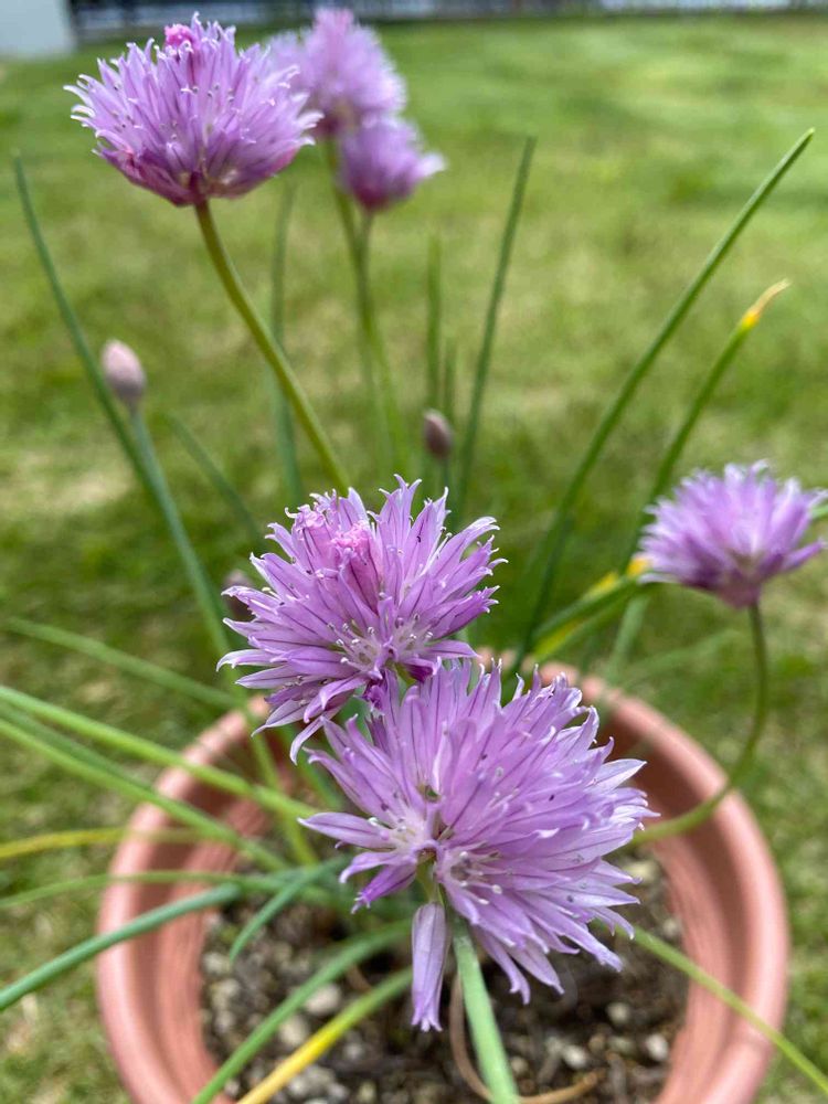 チャイブのお花が雨の日を経て咲いていました💜こんなに可愛いネギ坊主なら大歓迎😊