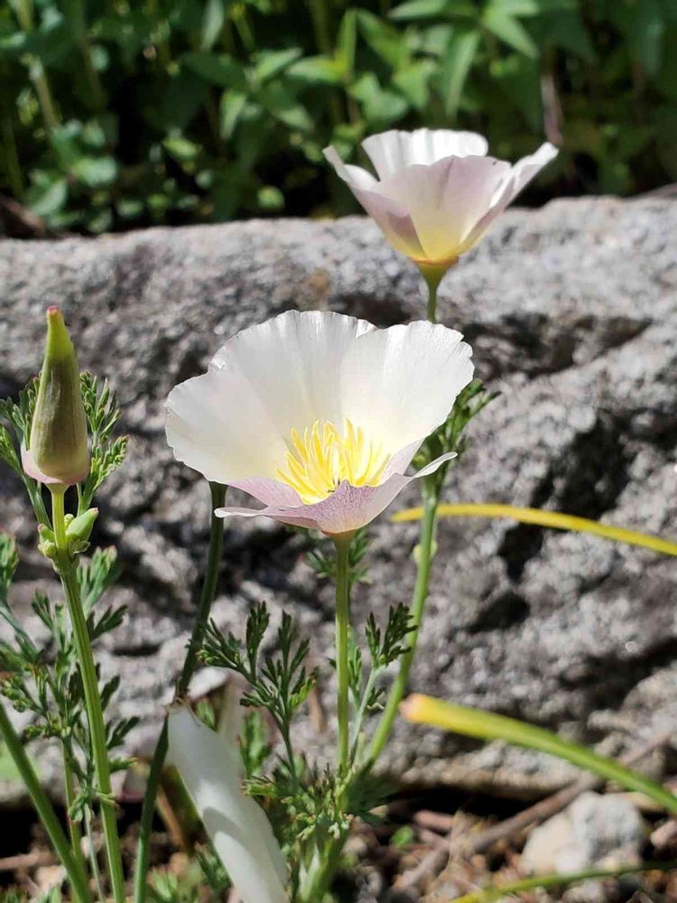 白いハナビシソウが花畑ではなく、砂利の中で咲きました😅