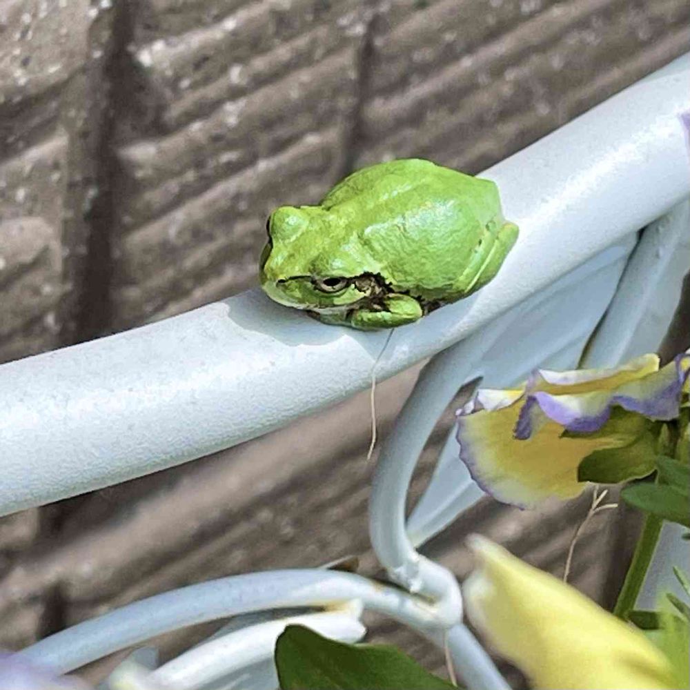 雨蛙は、お庭のそこらじゅうでみかけますよ~、花をゴソゴソするからでてきちゃいました💦迷惑そうな顔してます🐸