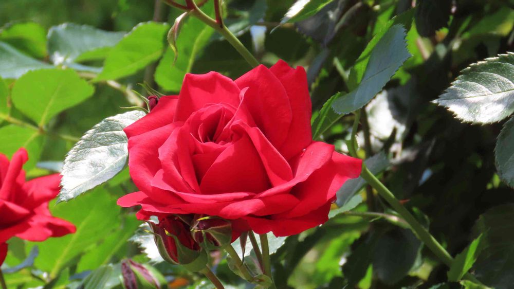 赤は太陽の象徴でもあり、活力みなぎる色彩です。このシンパシーはドイツで生まれたばらです。ビロードタッチのなめらかな花弁、輝くような赤い色彩は中心少し黒みを帯び、褪色が少なく鮮やかさを長く保ちます。葉は光沢のある深緑、しなやかに伸びる枝はトゲも少なめです。