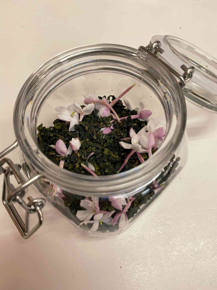 2021.04.30 少し良い台湾烏龍茶が手に入ったので手作りジャスミンティーを作ろうかと思います✨台湾烏龍茶は中国烏龍茶より緑茶に近い感じで匂いも浅く、薫りを入れるのに良いです。今回は「薫花法」でジャスミンの薫りを茶葉に入れます。私は鼻が悪いので少し強めに薫り付けします。なので3回ほどジャスミンの花を入れ替える予定です。入れる花は実家のハゴロモジャスミン。アラビアンジャスミンが王道ですがハゴロモジャスミンは香りが強く、薫りを付けるのなら良いです。花は咲く直前のを摘み、薫花中に開花する感じです。完成が楽しみです✨