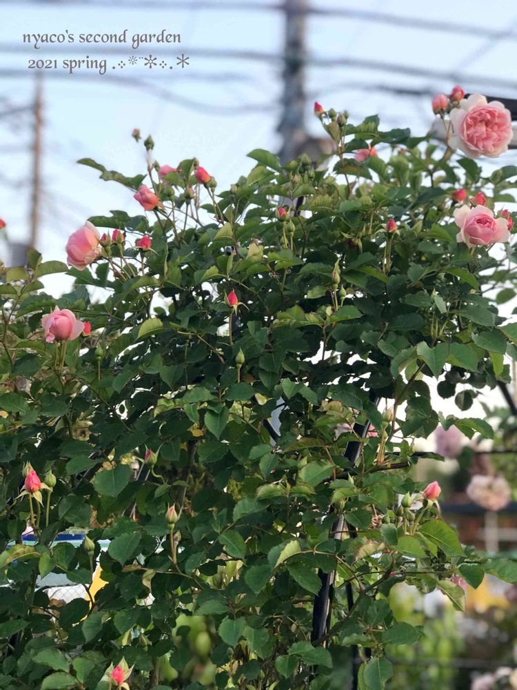 第2ガーデンのアーチのジュピターの反対側も綻んできました😍✨ こちらの方が花付きが凄いんです💓 これまたベランダにいた頃はちっとも咲かなくてがっかりしていた子💨 まあ〜✨こんなにツボミつくとは思わなかった〜👀 しかも花形と色まで別人❣️ てか、これが本来か😂😂😂