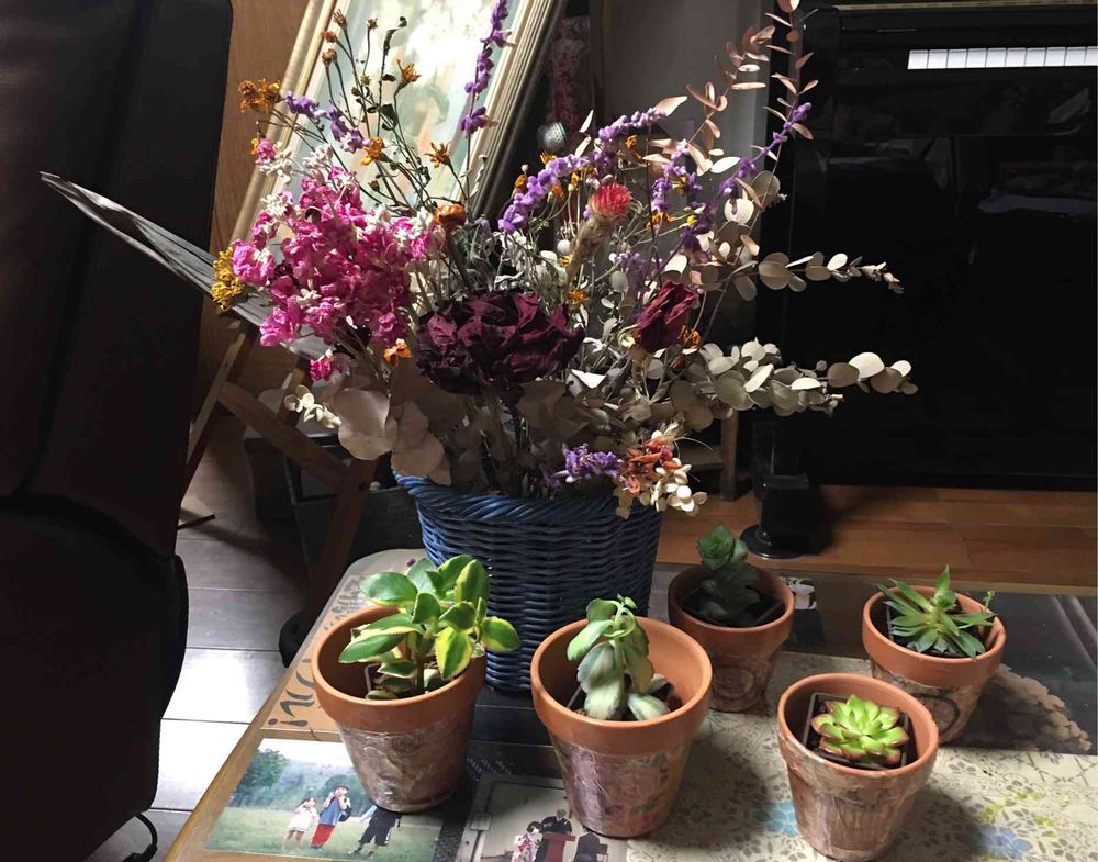 今日はなつ子さまのみどりのまとめを参考に、リメ鉢作りに挑戦してみました‼️と言っても、いい加減な私は、100均で買って来た鉢に専用紙を貼り付け、上から専用液を塗っただけーそれでも世界に1つー満足して、自分で干しておいたドライフラワーと一緒に、記念撮影しました❣️❣️