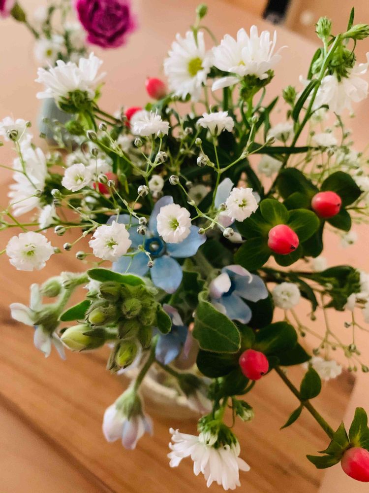 小さい白い花はカスミソウ。赤い実はヒペリカム。
