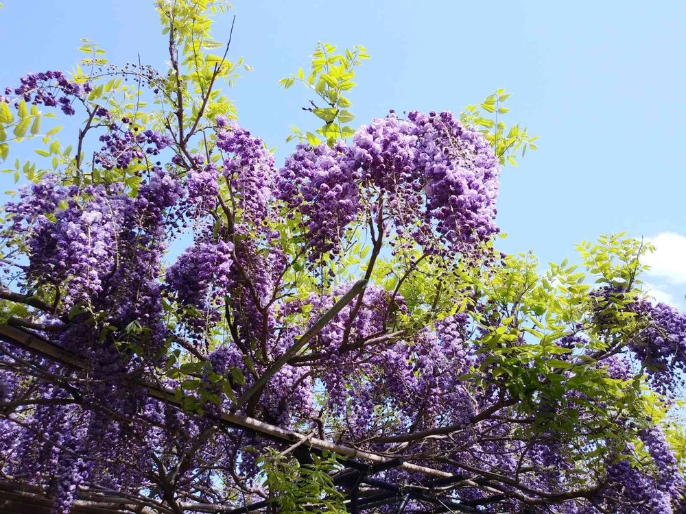 頭上を覆い尽くすように咲き広がる藤の花「八重黒龍」💜💜💜