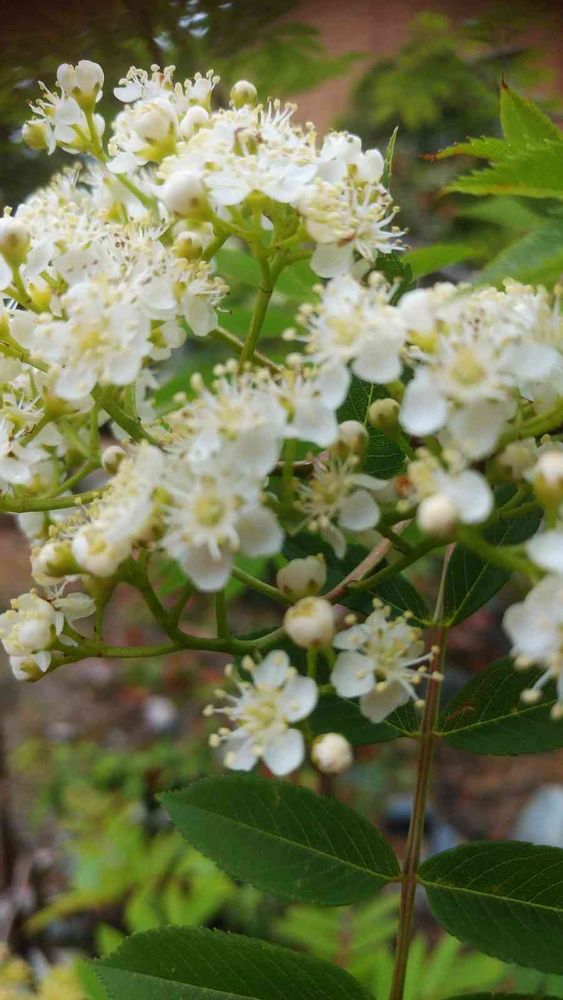 ナナカマドの木に白い小さな花が満開!美しい姿を見せています。