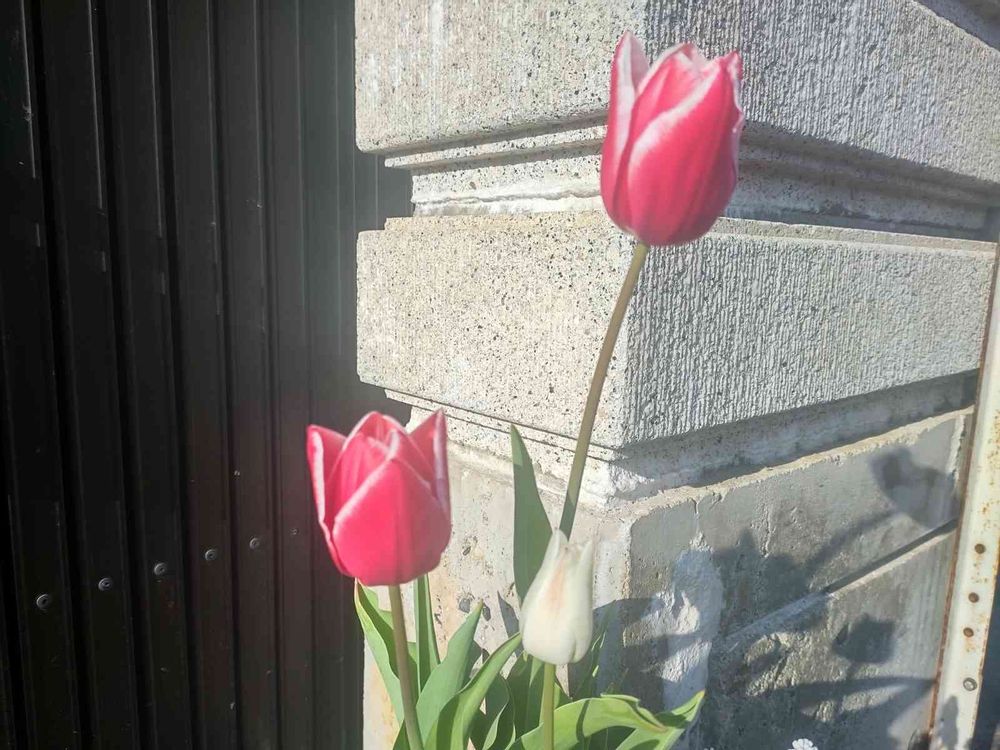 赤しか植えてないはずのチューリップに生成り色登場❤️🤍❤️