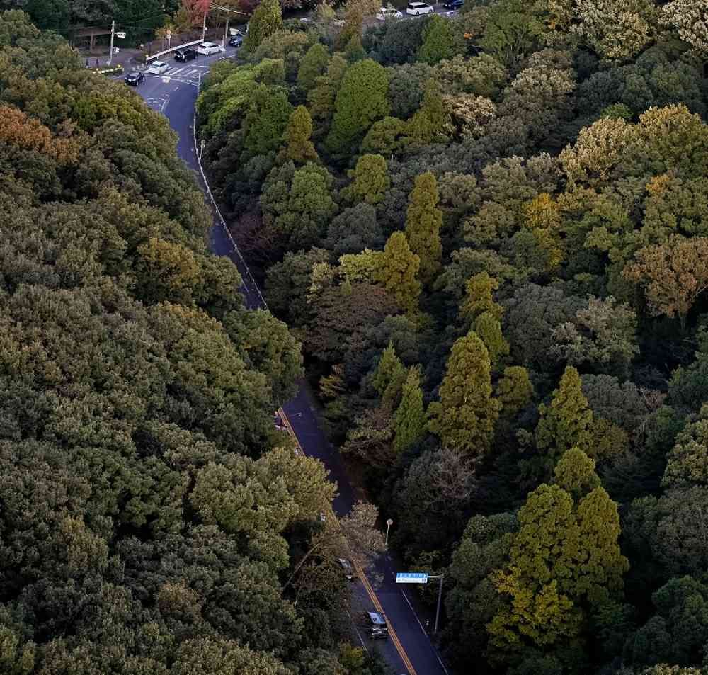 東山スカイタワー360度パノラマ展望室(地上100m 標高180m)から見た、地上の紅葉