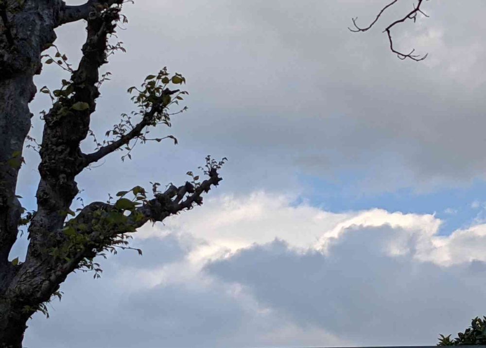 昨日夕方の欅の新葉と雲の写真を横向きに写したものです。…何か飛んでいるような雲が捨て難くて…。