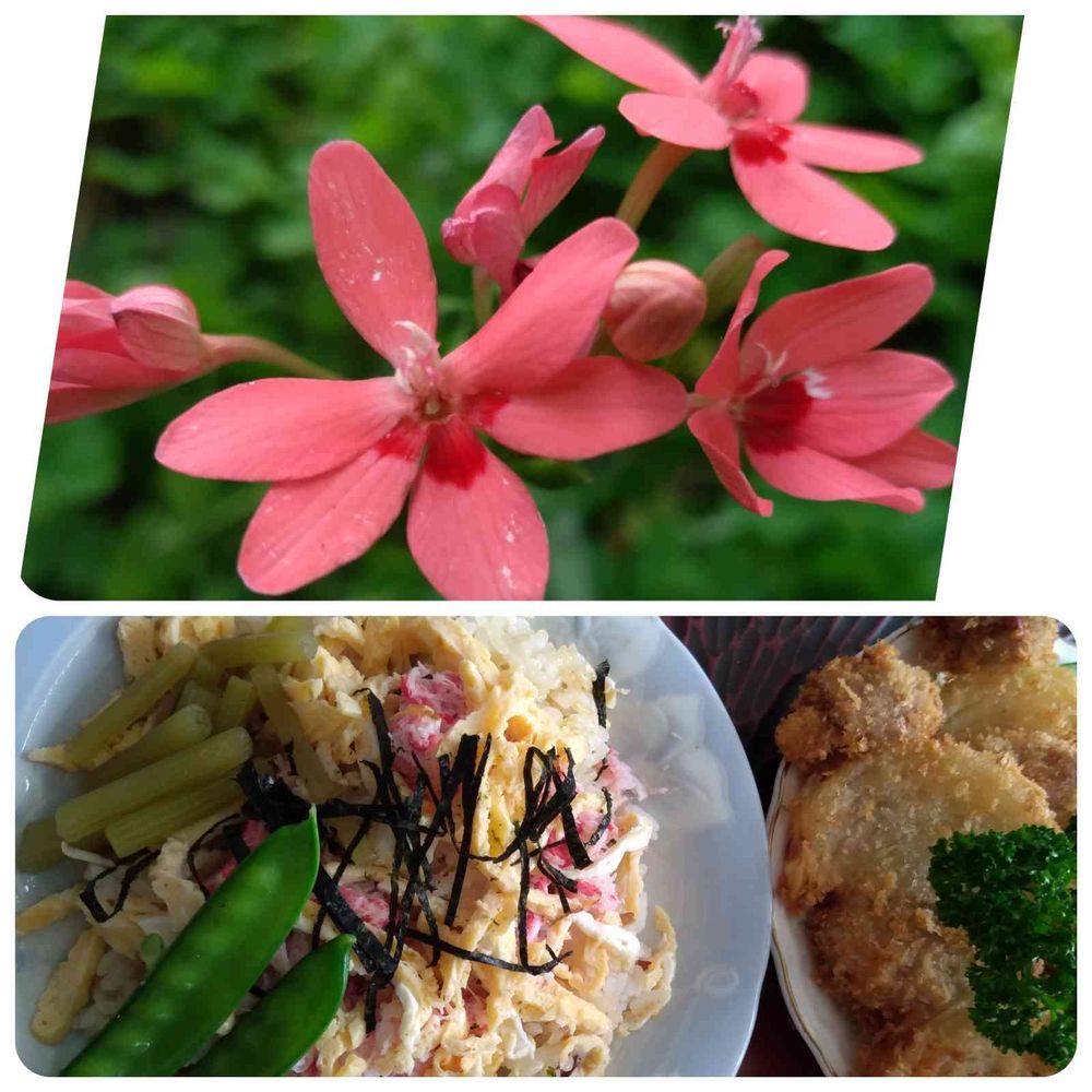 寿司めし混ぜ御飯と串カツをセットし、庭の蕗を添えて~