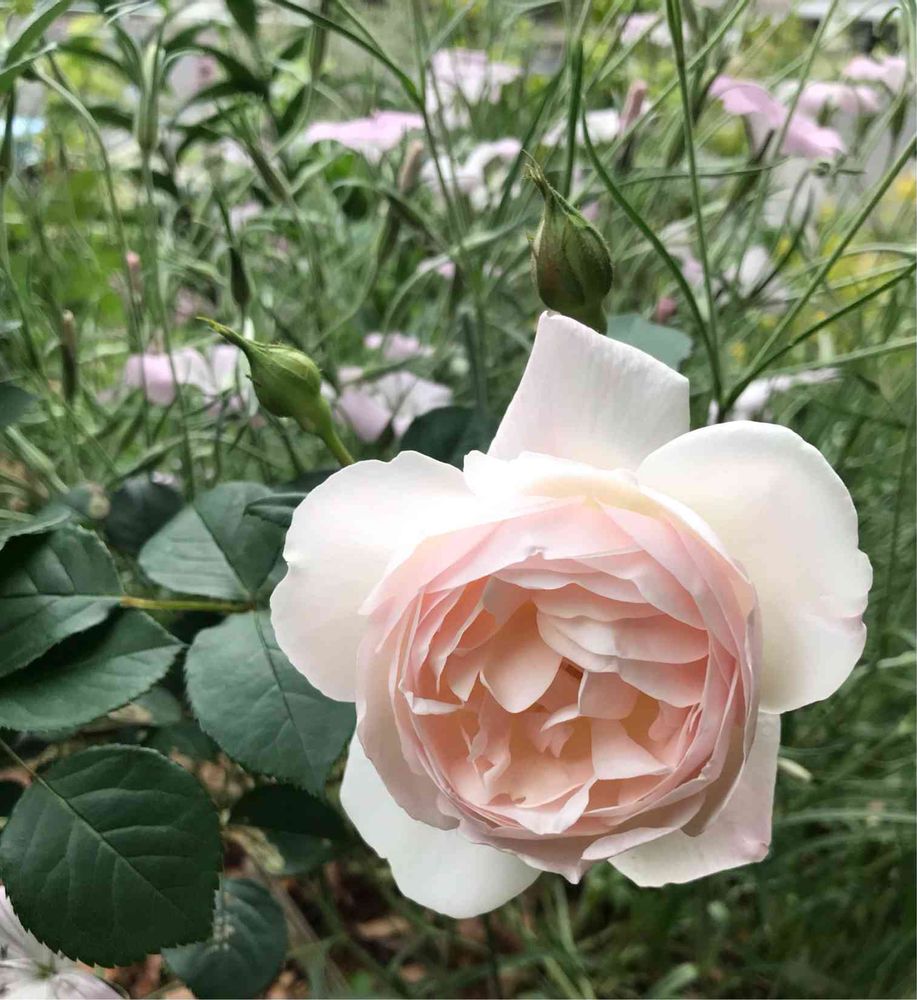 淡い色なのに、脇役におさまらないところが素敵なバラです😊