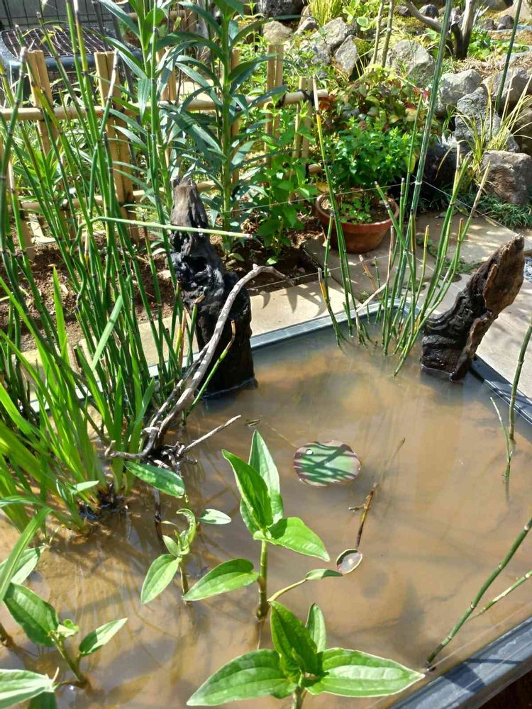 トロ船からの様子です。手乗りハスの浮き葉が展開し始めました🎉今年はトロ船レイアウトにしてましたが、水深が浅かったかな深さ約5cm位しかない😅💦