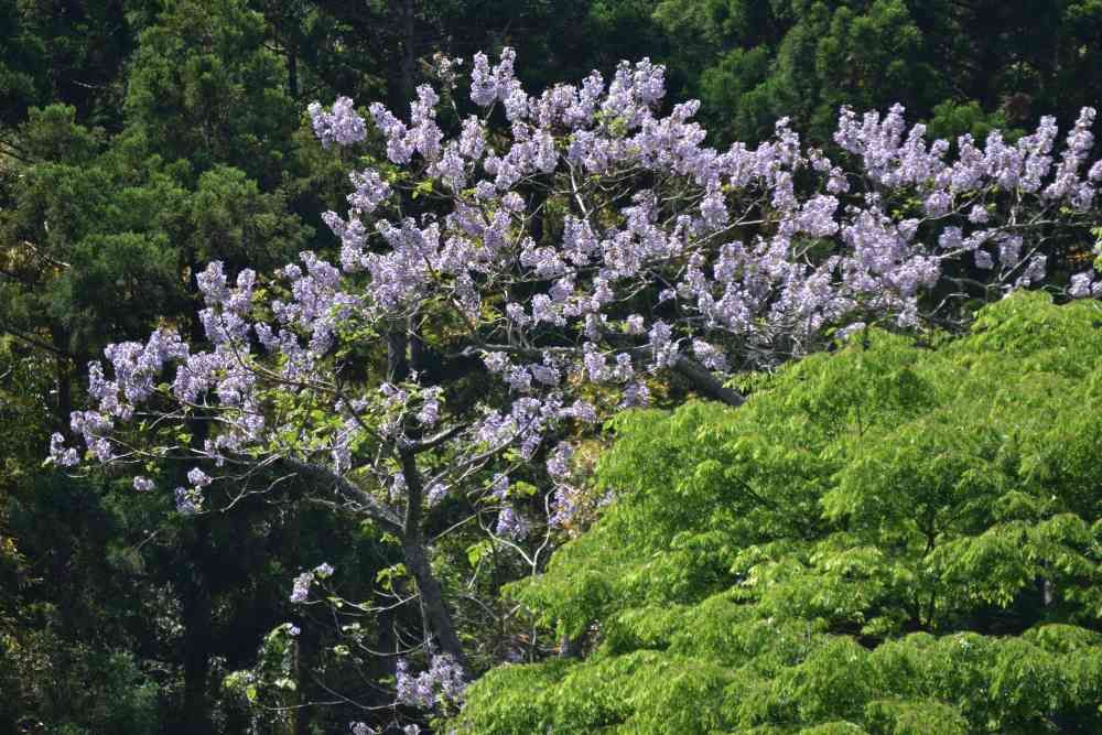今年は桐の花の満開を見ようと思い、野鳥撮影をしながら里山を歩き回ったところ、2ヵ所ほど大木があることが分かりました。遠くに見える満開の桐の木を発見した時は嬉しかったですね。桐の花の落ち方は"落下傘"のようでした。