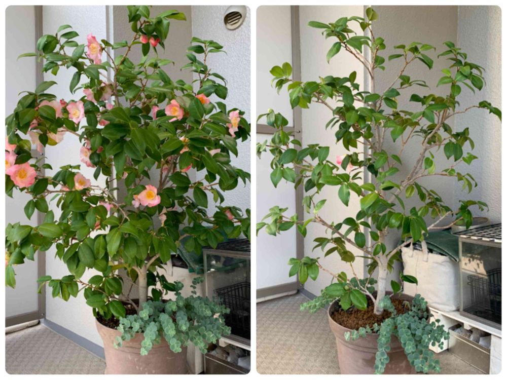 昨日、椿の花後の剪定と土替えを済ませました。(1週間前との比較)