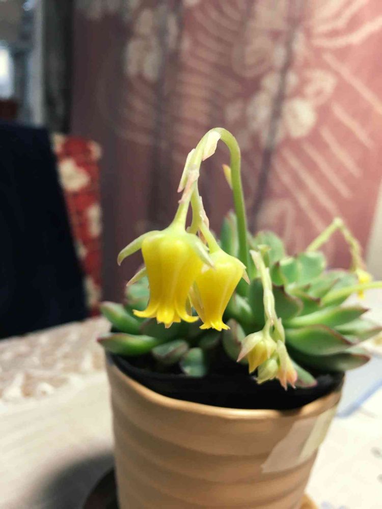 花芽4本出ていました、プレリンゼが素敵な黄色の花が咲いていました。壺咲だったので、まだ咲かないと思っていた。然し、下から眺めたら、雄しべが見えて… 。『咲いているー』慌てて記念写真📸👍🏻間に合った〜❣️