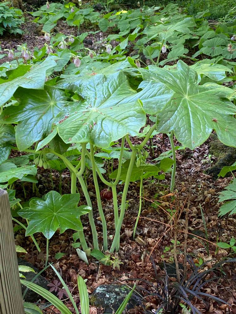 太い茎の先端に大きな角のある葉を2枚広げ、葉の下に赤褐色の抱え咲きの花を数輪咲かせます。このハスに似た葉の角の数から「六角蓮」や「八角蓮」と呼ばれています。また、2枚の葉のつけ根部に花が咲くものを「タイワンハッカクレン」、茎の途中に咲くものを「チュウゴクハッカクレン」と呼び分けられています。2枚の葉は広がった段階で成長を止めます。花はやがてボール状の実になり、タネがはじけます。冬前にはがっちりしていた茎もやわらかく倒れて落葉し、休眠に入ります。地下には堅いバルブ状の根茎が連なり、大きな次の芽が形成されています。