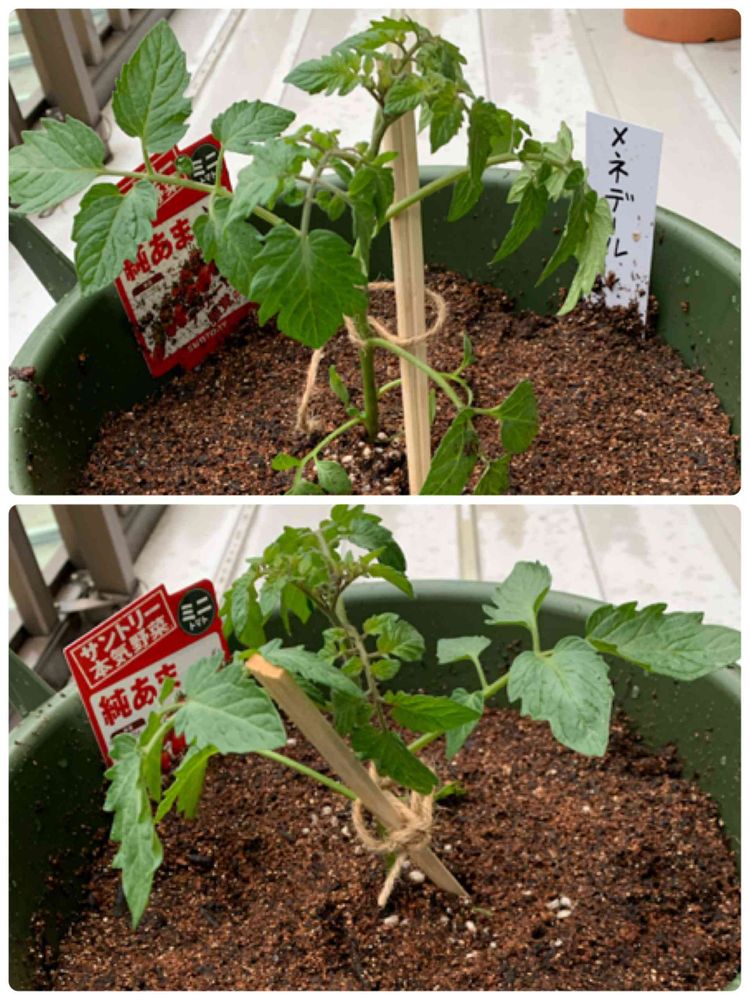 野菜用培養土(元肥入)を使い、片方にはメネデール100倍に薄めた水を2リットルたっぷりあげて、片方は水のみ2リットルをあげました。どちらも下から水が出るくらいの量です。苗は14cmくらいの同じ苗を使ってます。2階ベランダで栽培。