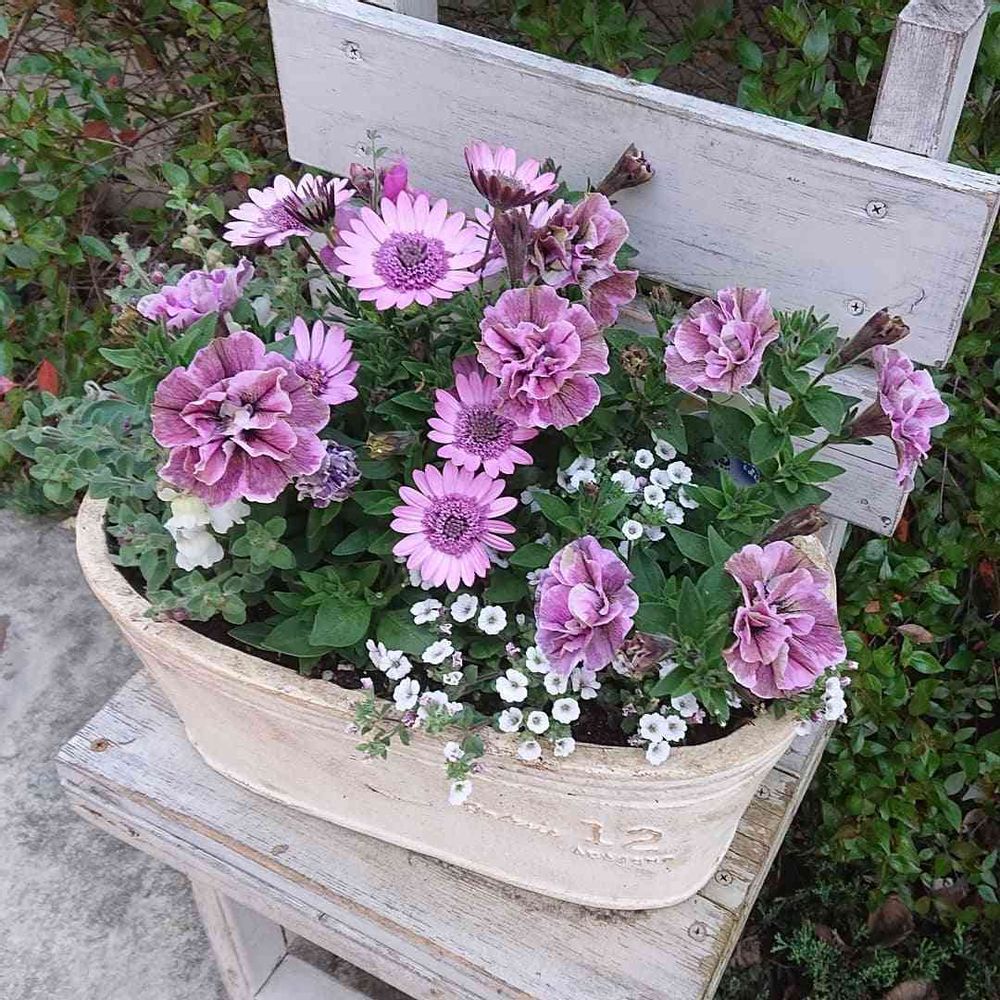 八重咲きオステオスペルマム“クレージュピンク”、八重咲きペチュニア“ジュリエット・モダンピンク”、金魚草“アールグレイ&シルバーピンク”、オノエマンテマ(カーペットカスミソウ)です。