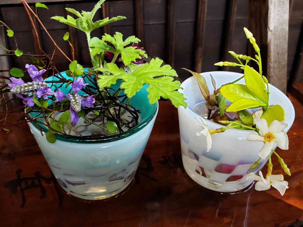 庭で見繕った定家葛、蚊連草、ラベンダー等を満州鉄道のコップに