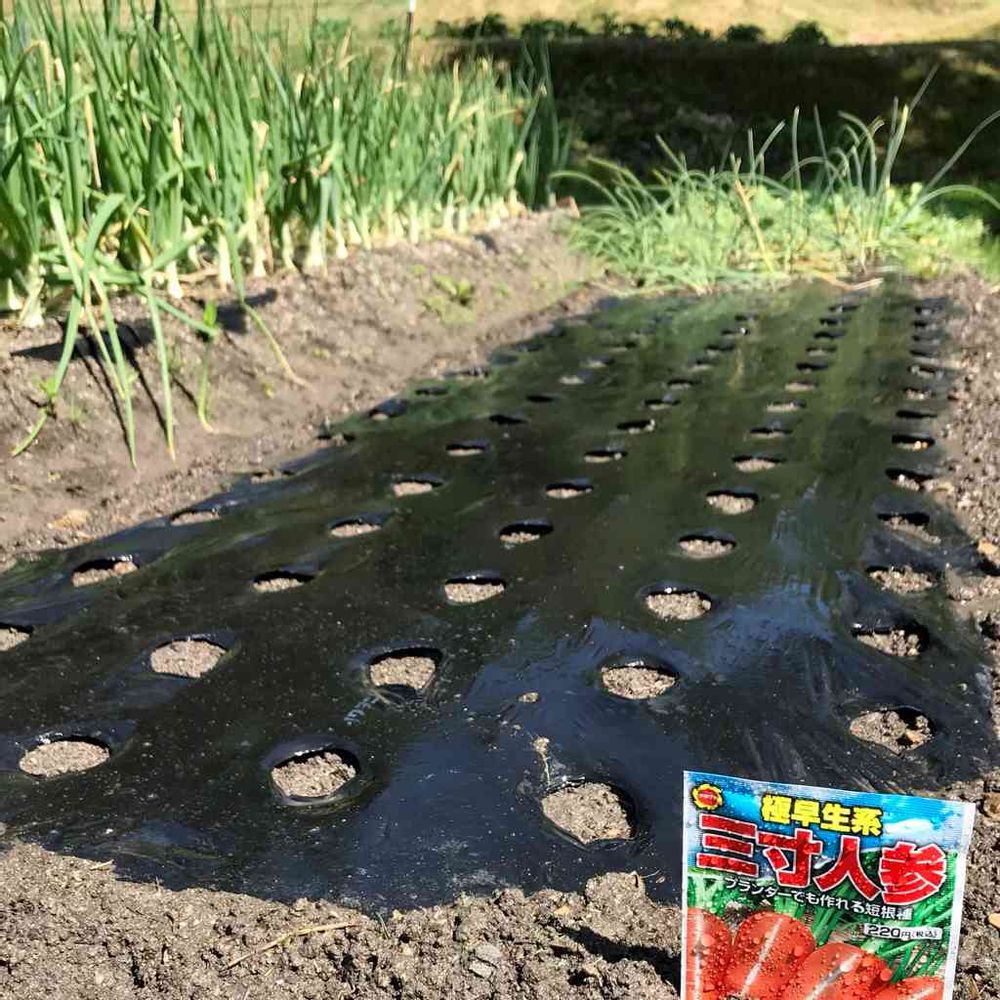 一般的にはすじ蒔きして、間引いていくんだと思いますが、草取りしない事重視の我が家では、このマルチ穴🕳にばら蒔きし、3,4本まで間引いていきます😊。