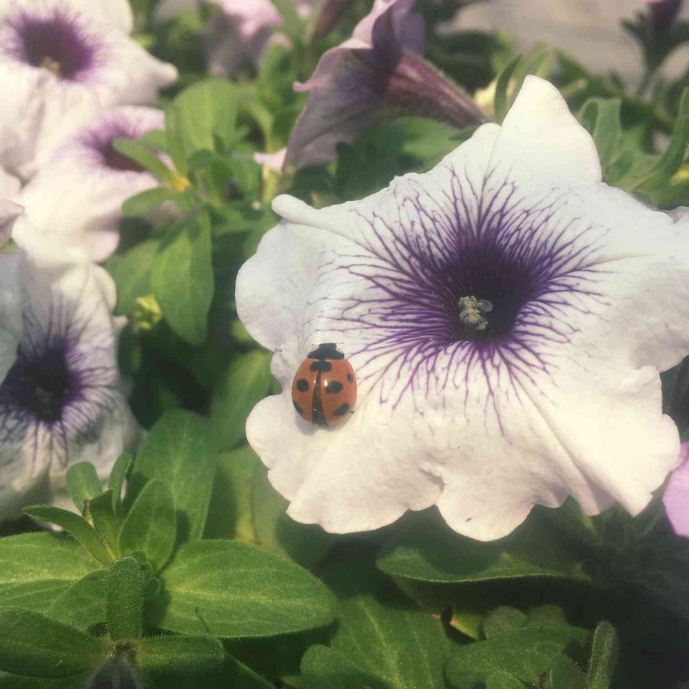 ペチュニアさん中央が濃い紫色💜 綺麗ですね〜💜🎶 🐞も最近見かけなくなりました😌