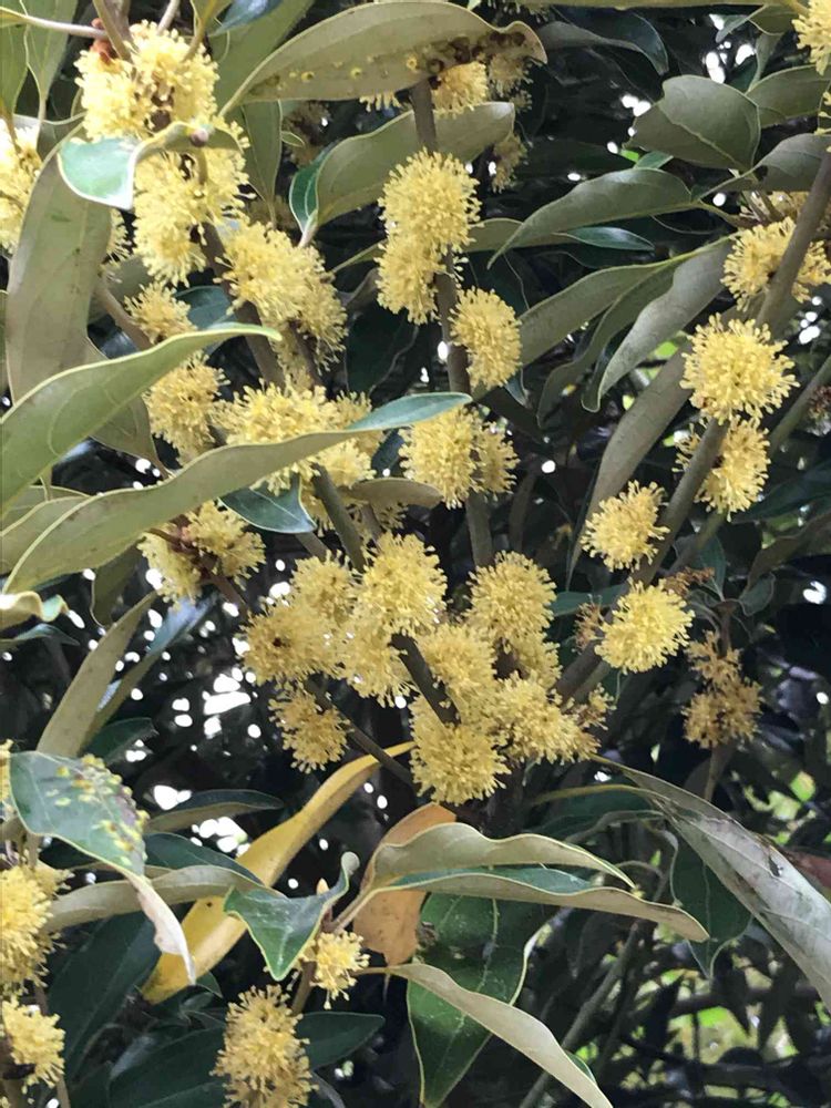 シロダモという木みたいです。葉の裏が白いからだそうです。実は一年かけてなるので、花と実が同時に楽しめるそうです。