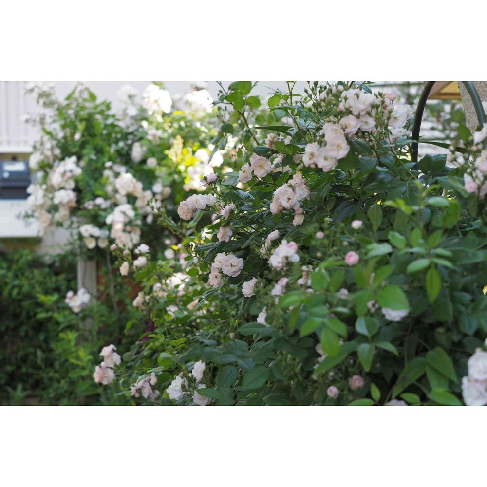 蔓バラ・ペレニアルブラッシュの開花が進み、箱庭の通路の右側が白くなってきました!!