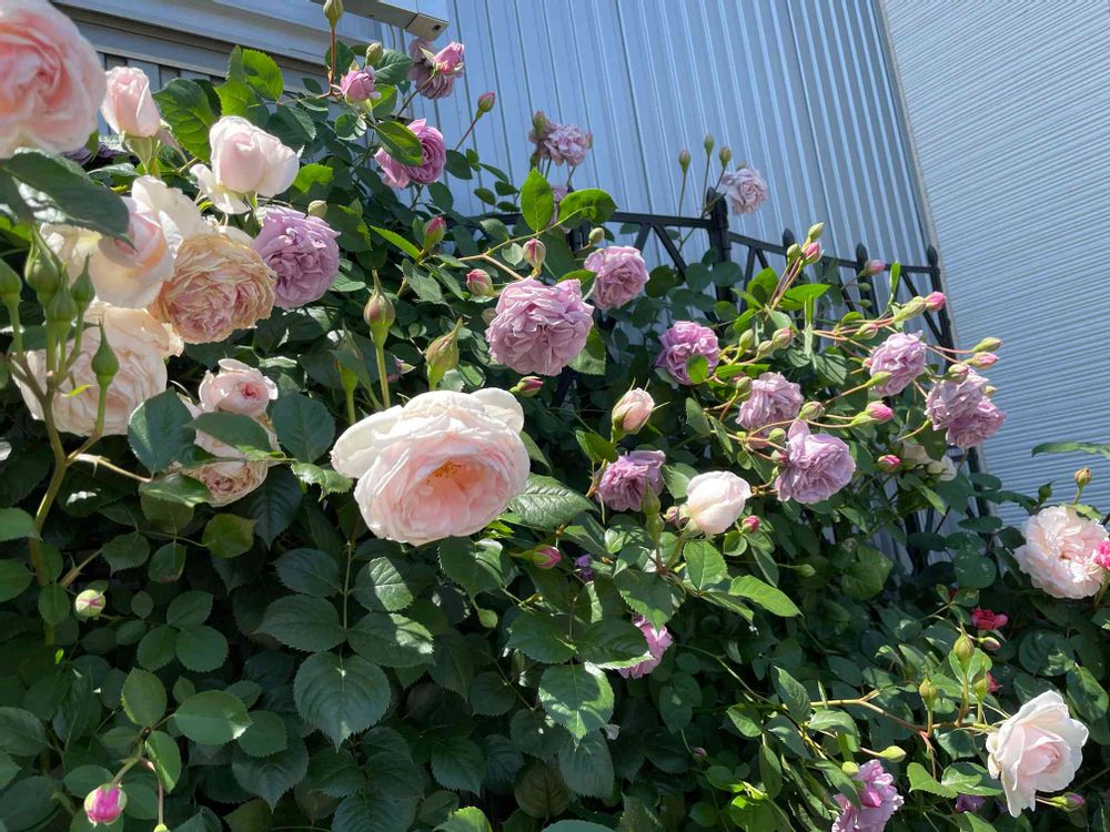 左側からローズドゥグランヴィル、レイニーブルー、プシュケの開花が進んできました!