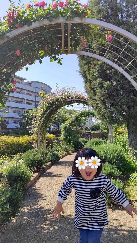 昨日🍙🥪持って公園に行く途中、薔薇の 🌹のアーチが綺麗でカメラ向けてたら、「バァバ‼️」と呼ぶ声が😅一生懸命次々とポーズとってました🤭変顔がお得意😜😋。
