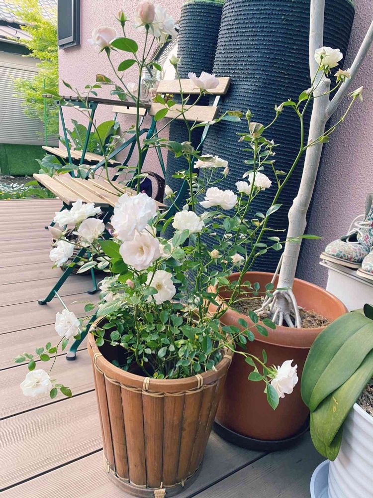 つるバラ「サマースノー」お花屋さんの見切り品だった子。こんなに綺麗です✴︎葉が黄色くなり易く根鉢がキツそうなのですが、今の時期に鉢増しして大丈夫かな…?