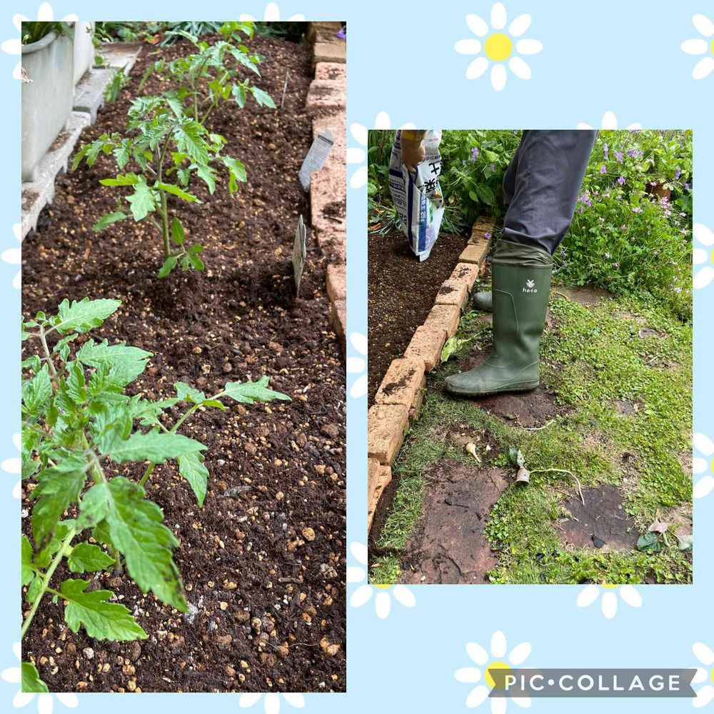 ウッドデッキの脇にミニトマト🍅の苗を植え付けました。モニターの長靴、作業もはかどります。なんてったって軽い👍😃
