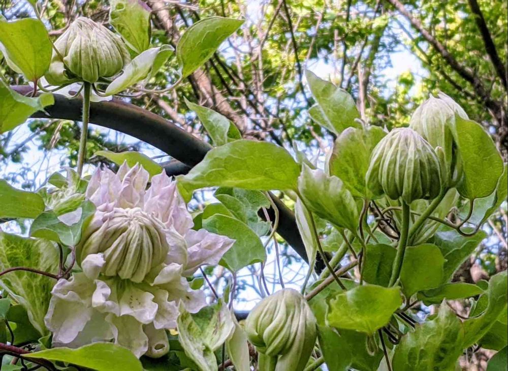 炉で燃やす作業が一段落してアーチを見に行くと、白い方のクレマチスが上の方で開いていました。白ですが八重で華やかです。…充実した蕾も沢山あって楽しみ。…疲れも少し取れる思いです。