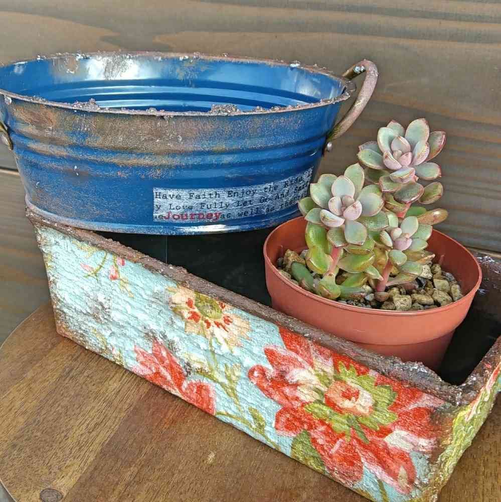 青い缶はもとの色を活かして錆び風加工、パウンドケーキ型はザラザラ加工とデコパと錆び風加工してみました。