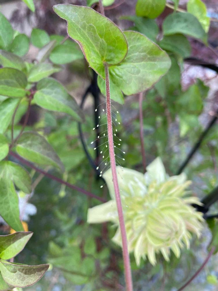 クレマチスの茎にクサカゲロウの卵が産え付けられていました。