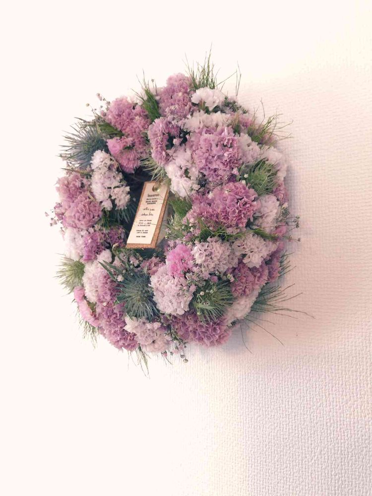 3色のスターチスを使ったリースができました。ミモザよりも扱いやすくて作りやすかったです。 形は少しイビツ‥。