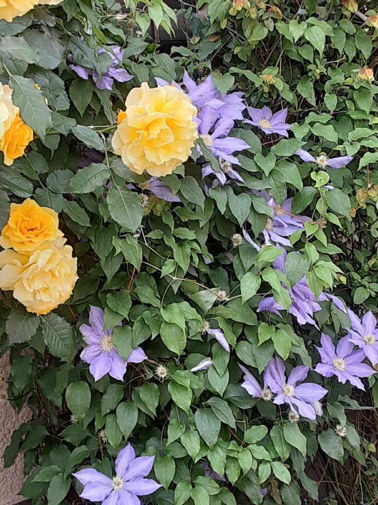 「てっせん」と教えてもらいました。調べたらクレマチスとも言うらしい。黄色のバラとクレマチス