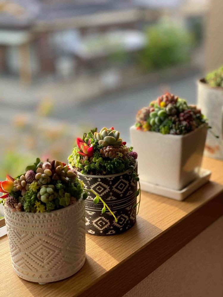 寄せ植えも鉢も、めちゃ可愛いですね💕(๑˃̵ᴗ˂̵๑)奥様作のカゴ盛り🧺も素敵✨ピンクの金平糖みたいな丸い子はセンペルの仲間ですか❓😳