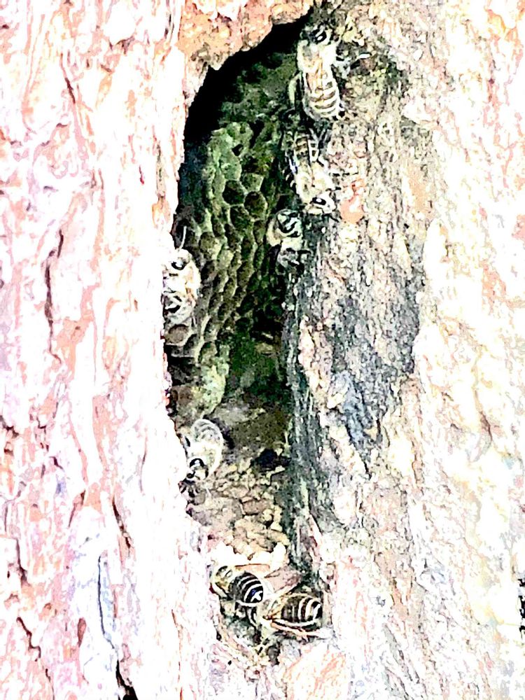 4月11日、日光市「霧降の滝」周辺で見つけた、赤松の大木の地表から約1.3m辺りに開いた、大きなムロに出入りする、天然ミツバチ🐝🐝🐝たち❣️の巣