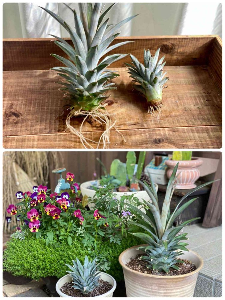 パイナップルの葉っぱから根っこが出てますねえ🎵初めましてです😃葉っぱの上に実がつくんですよね‼️実がなったらいいなあ報告お待ちしてます😃