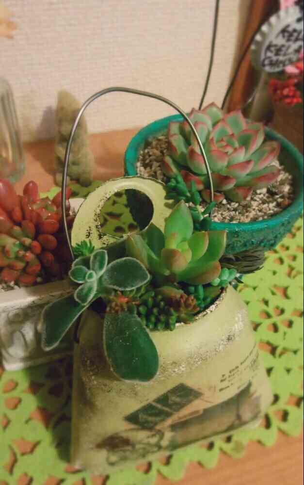そうかーこのリメバッグは蓋つきだから壁にもかけれるね〜〜 ハムシーちゃんかな❓寄せ植え 背の高い子を後ろにやって高さをだしたりするかなぁ あとはメインを決めてまわり彩るかんじだよね〜〜寄せ植えってある程度の多肉をもってないとできないもんねぇ わかるわぁ