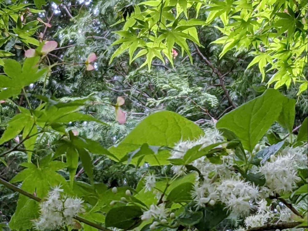 今にも雨が降り出しそう…。満開のサワフタギと赤いプロペラが可愛いイロハモミジが枝を触れ合っています。お隣のヒノキ林の深い緑も見えています。