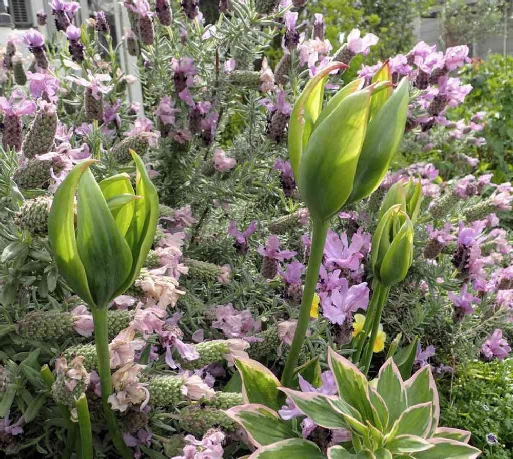 グリーンワールド参加中です💚前出の、チューリップ・グリーンキングです😊終わりかけのラベンダーと、斑入りのアルストロメリアとのコラボ💜こうやって見ると、それなりに絵になっているかもー。。。.って、ひいき目に見すぎかなー🤣🤣